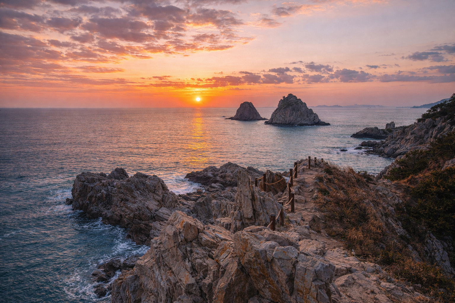 이 길을 걷다 보면 마치 해상공원에 와 있는 듯한 착각에 빠지게 됩니다. 울창한 숲길과 기암괴석, 그리고 발아래 부서지는 파도 소리가 어우러져 스트레스가 저절로 해소되는 기분이에요. 맑은 날에는 대마도까지 보이는 환상적인 조망도 빼놓을 수 없는 매력입니다.
